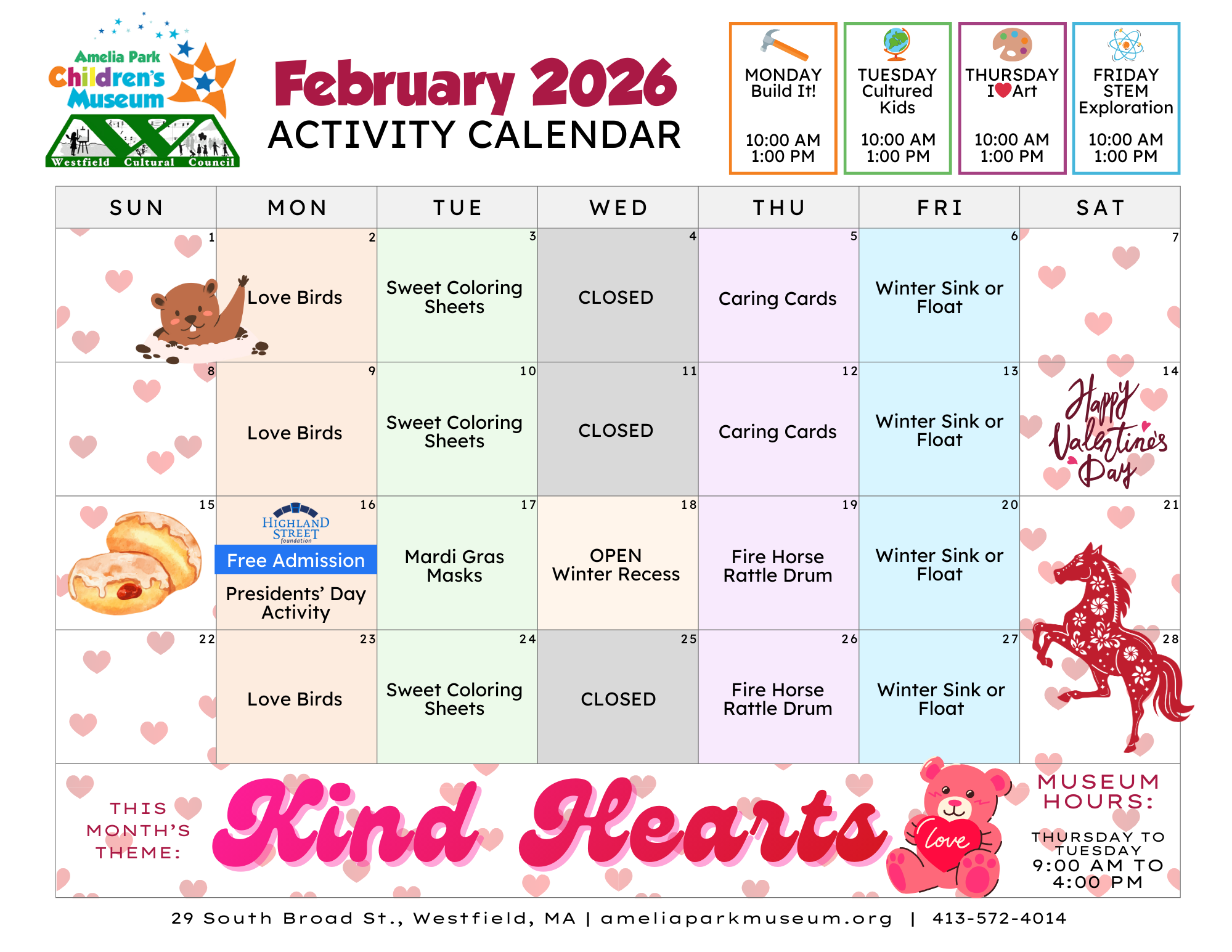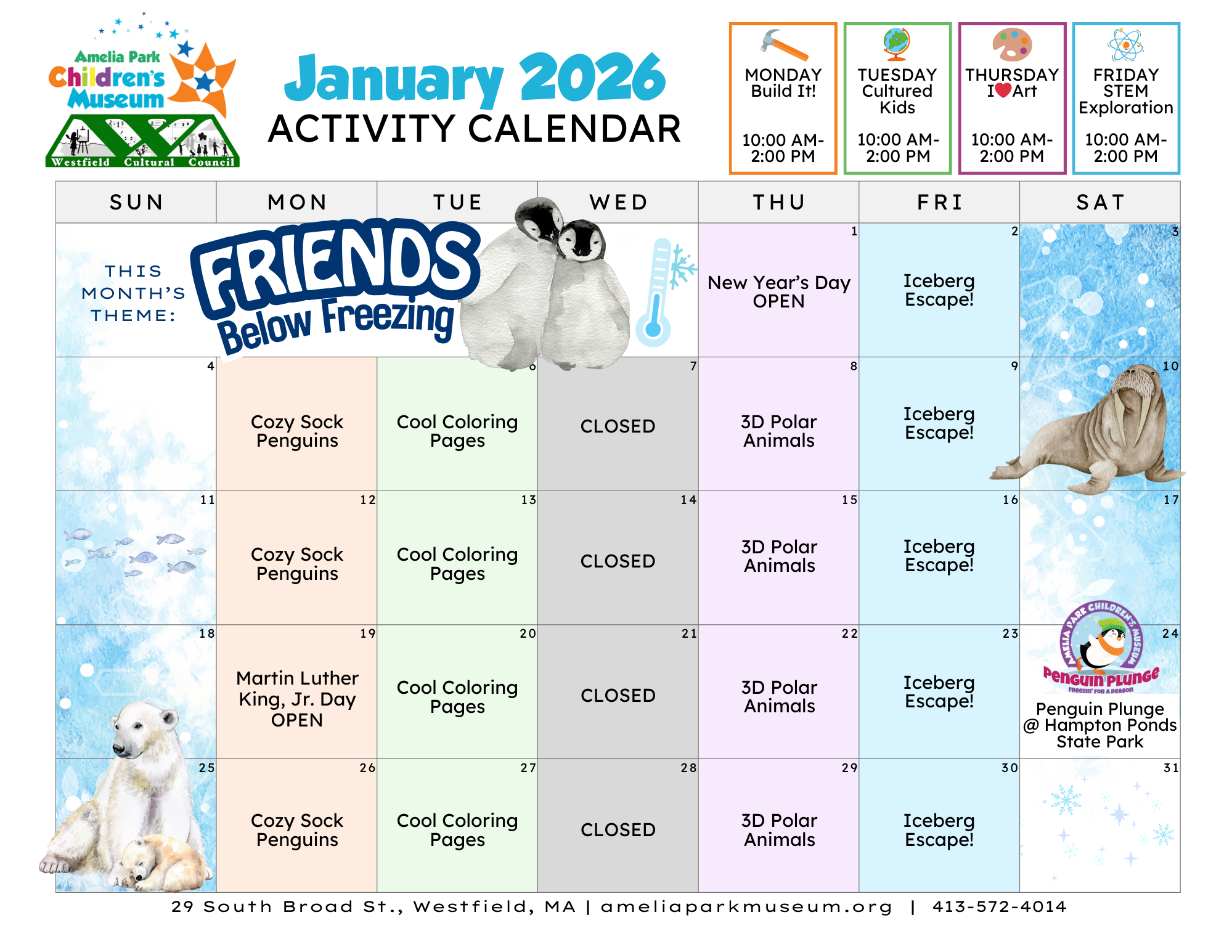 In addition to exploring our 15 fascinating exhibits, we invite you to join us for our weekday program activities offered at 10am and 1pm.
